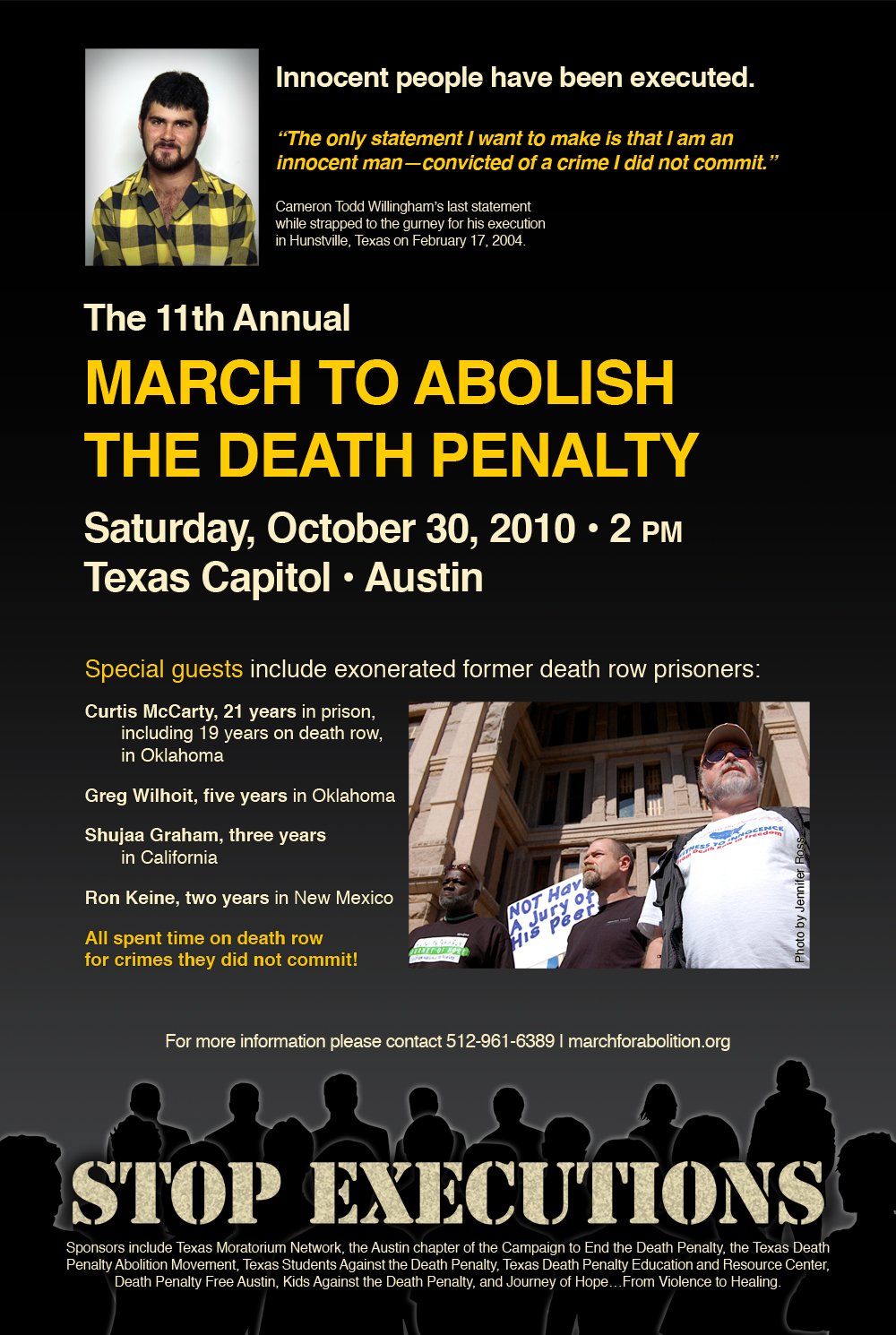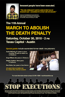 Tonight October 21 at 7 pm in Austin, we will have the last organizing meeting for the Oct 30th 11th Annual March to Abolish the Death Penalty. Everyone is welcome to come. This will be the final planning meeting before the event itself, although we will likely schedule a work party for one day next week to prepare materials for the march.