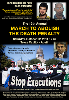 The 12th Annual March to Abolish the Death Penalty is Saturday, October 22nd, 2011 at the Texas Capitol at 2 PM (on the north side of the capitol).
